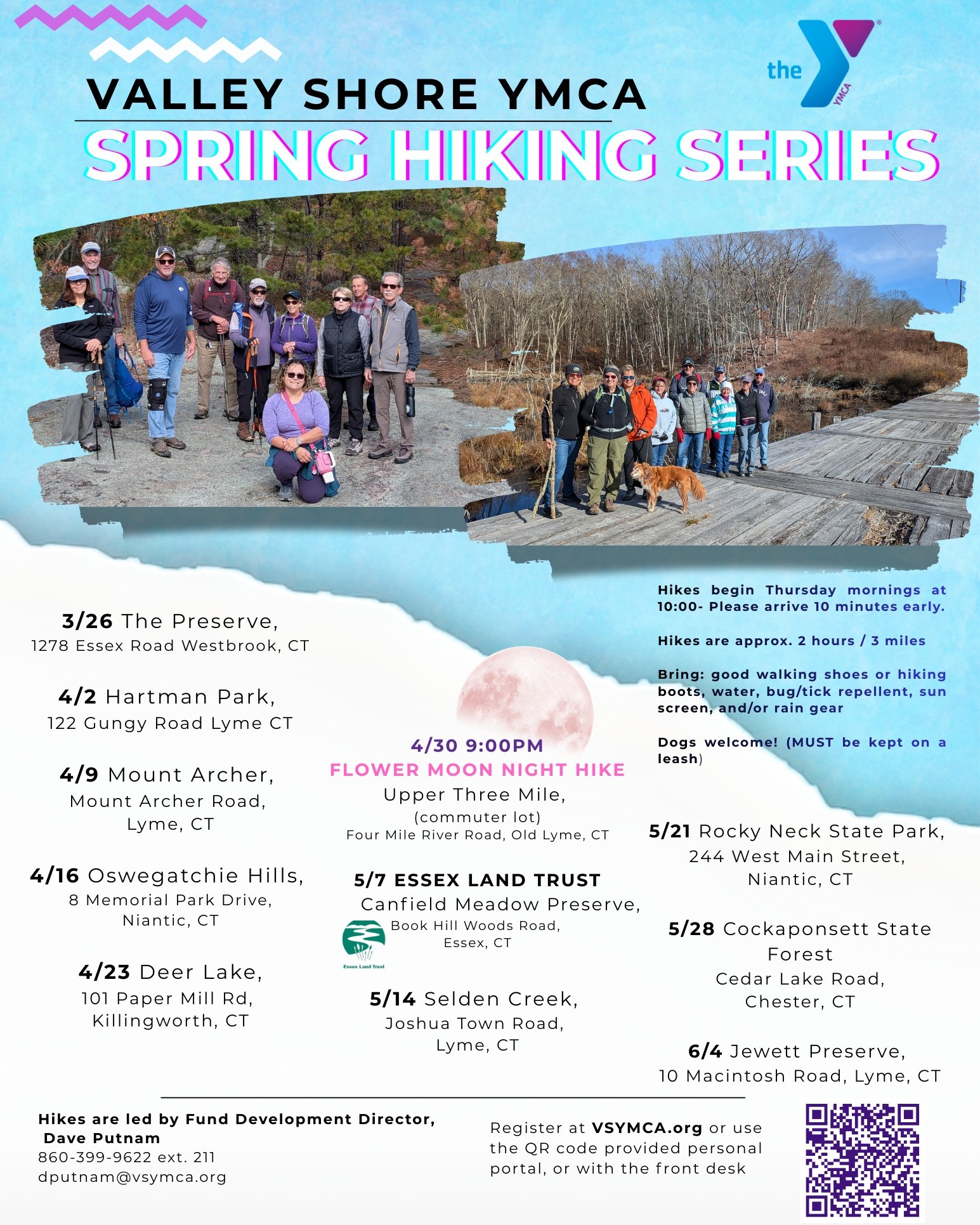 Get outside with the Valley Shore YMCA this spring for our Spring Hiking Series. Beginning this month, hikers of all experience levels are invited to join us on Thursday mornings for fresh air, movement, and great company on some of the shoreline’s beautiful trails. This season includes a few new hikes along with a special Full Moon Night Hike, making it a fun way to stay active and connected with community. Grab your friends and family and come hike with us. View the full schedule and details in the Spring Hiking Series flyer.